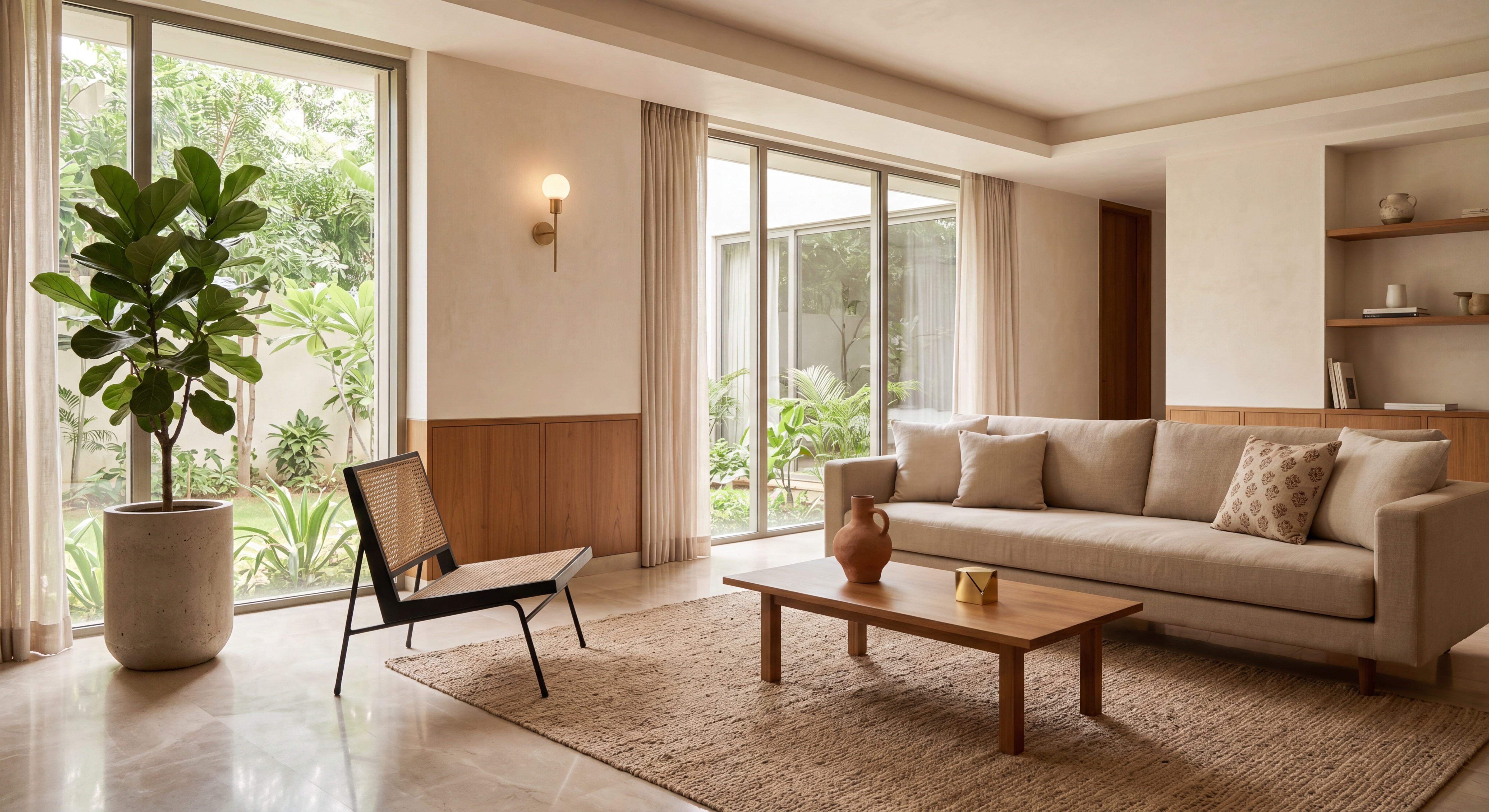 Clean lines, functional furniture, and a neutral palette that feels sleek without feeling cold. The most requested style in urban Indian homes effortlessly put-together and built to last
